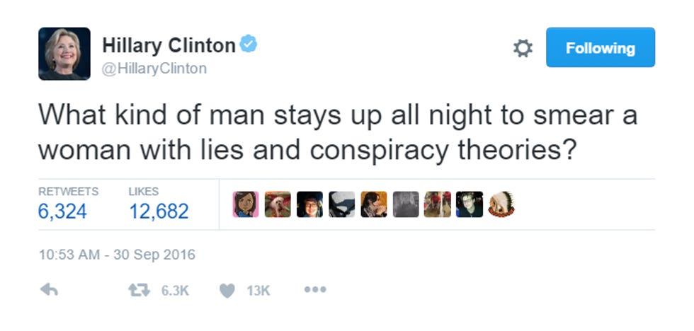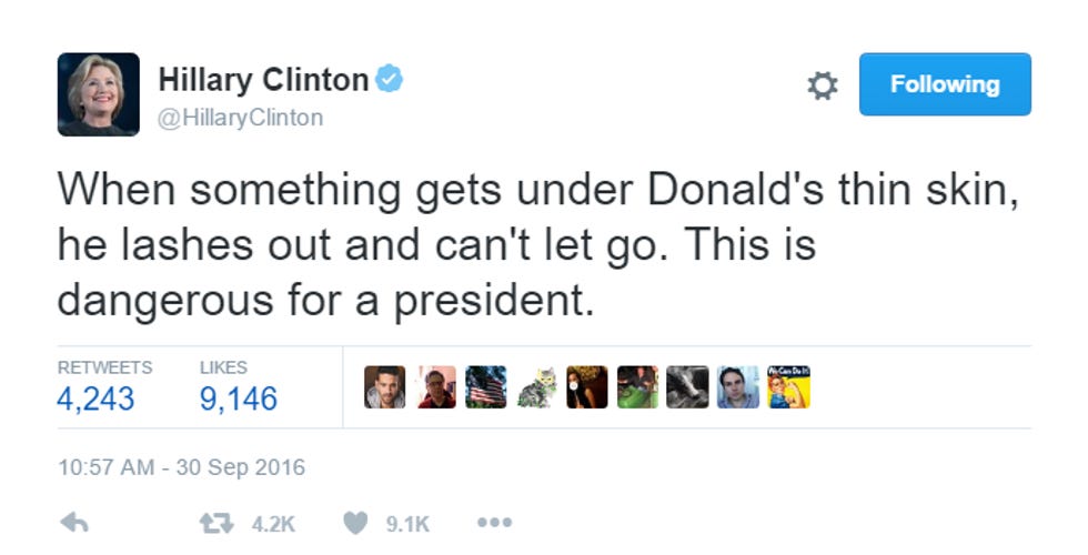Well guess what, chickenbutt? Hillary Clinton can Play Twitter too, but it's different when she does it. First of all, she has adult-sized hands, so she can type her tweets much faster. Also, her campaign is really, really good, and her people know how to help her put together a Twitter rant, whereas Trump's campaign is flaccid and sad. Oh, and there's also that thing about how Hillary's got thick skin, whereas Delicate Donald ...