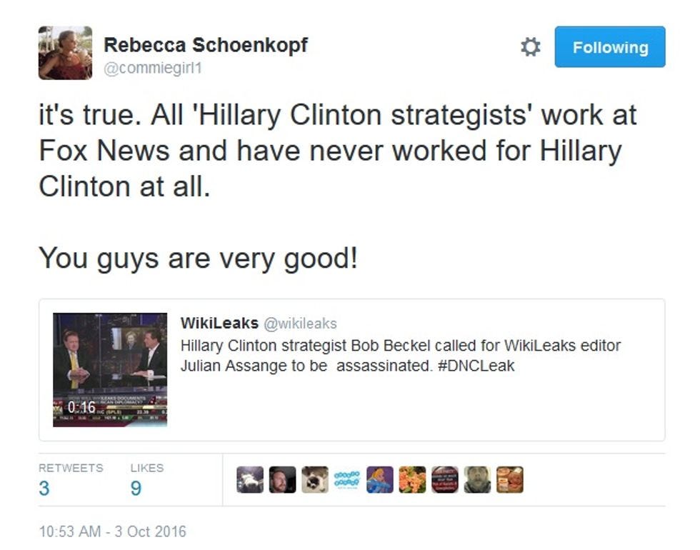 So remember how WikiLeaks was once this really edgy freedom-promotin' free speech place that seemed to live up to the geek slogan "Information Wants To Be Free," as embodied in the leaks that detailed slimy U.S. combat operations in Iraq and also Afghanistan ? But then Julian Assange also turned out to be kind of a creeper who wrote gross erotic fantasies? More recently, we're all left wondering whether Assange is in some kind of kinky three-way with Trump and Putin, and ick? So. We aren't sure what the fuck is really up with Wikileaks, but they sure did a fine job of raising Trumpettes' hopes that any minute now, WikiLeaks would release a huge Cocktober Surprise that would finally send Hillary Clinton to jail, except no, that didn't happen either: