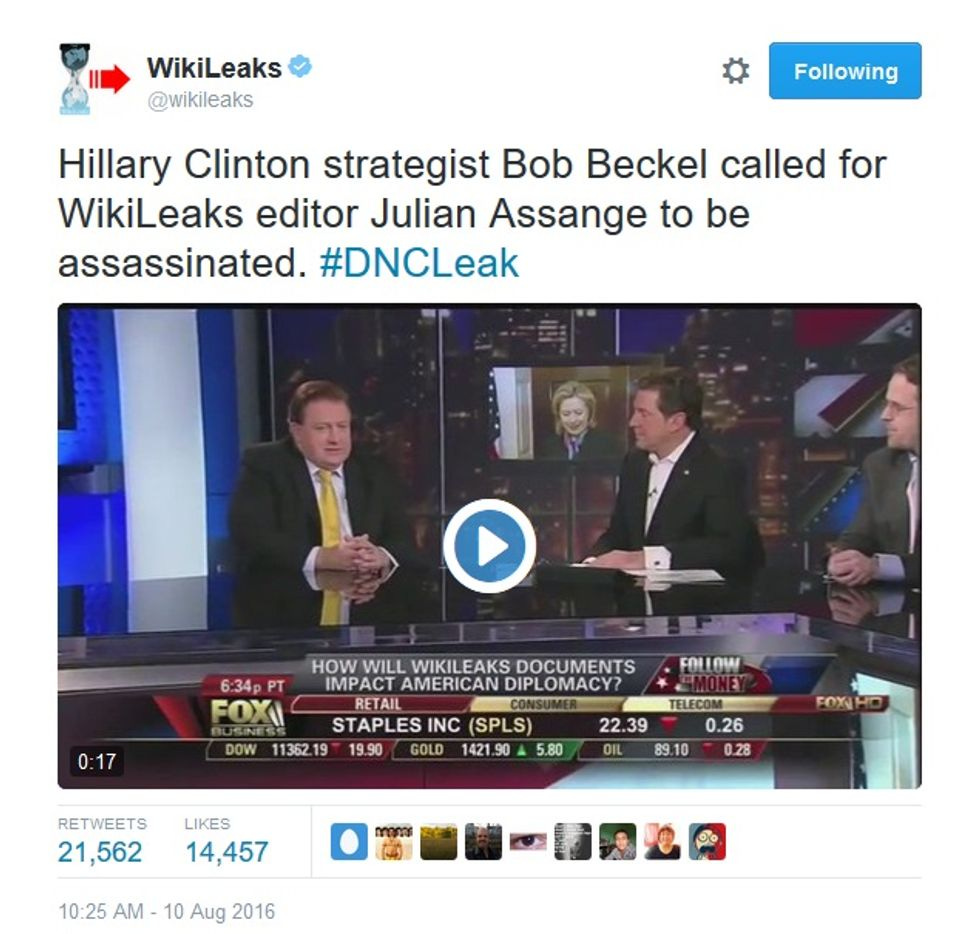 Wikileaks has been getting a little weird on its Twitter feed lately, too, with some astonishing news flashes that were pretty far from astonishing, or even reality, like a tweetlinking to a dubiously sourced story at conspiracy website "True Pundit" claiming that in 2010,Hillary Clinton explored a drone strike on Julian Assange: