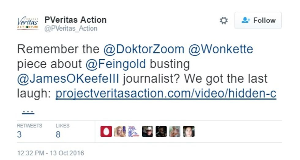 We found out about the new shocking video when O'Keefe's "Project Veritas" (that's Latin for "a small hairless rodent") showed up in our Twitter feed with this teasing taunt, suggesting they had at long last triumphed over our lefty lies: