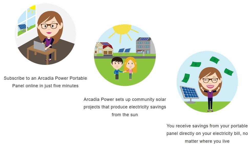 Well! Arcadia is now expanding into a new clean-energy market that lets people buy solar power without actually having to install solar panels on their own personal roof: You subscribe to get your very own solar panel in one of Arcadia's growing network of solar farms, and Arcadia takes care of making sure your utility bill reflects the savings from your own little patch of sun. Sound confusing? It is, because we are oversimplifying! Now shut up and watch this video from Arcadia, which explains it much more clearlike: