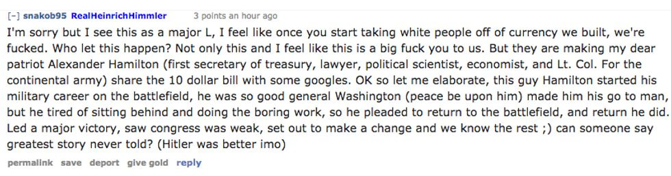 Another genius over on the Alt-Right subreddit felt that it was a personal assault on white people, because if they start letting non-white people on currency, they're all "fucked." Somehow. I don't know.