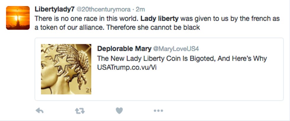 Keeping with tradition, many internet racists are now deeply upset by the portrayal of "Lady Liberty" as a black woman on a coin. Like this lady who didn't understand how Lady Liberty could be black when she was a gift from the French and therefore WHITE. You know, because there are not any black French people?