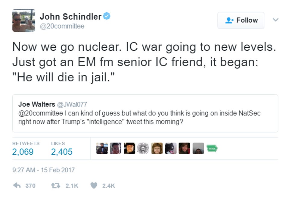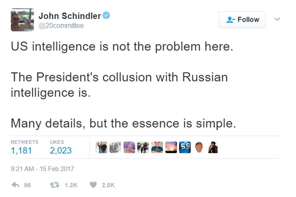 Well! Intelligence expert John Schindler, who wrote the original article about the IC withholding intelligence from Trump, had something to report on Twitter Wednesday morning: