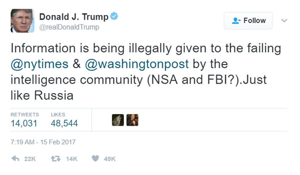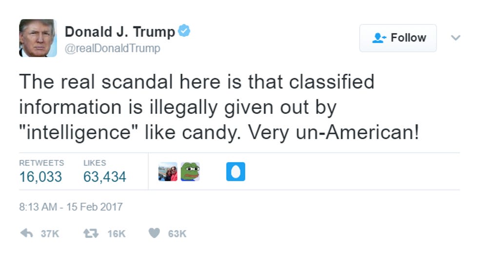 Y'all saw that Donald Trump very smartly and bigly went after the intelligence community again, right? Because the REAL problem is not his former National Security Advisor Michael Flynn's collusion with Russia, but with how the IC caught Flynnin the act with his mouth on the Russian ambassador's ass, and worse than that, THE FAKE MEDIA FOUND OUT: