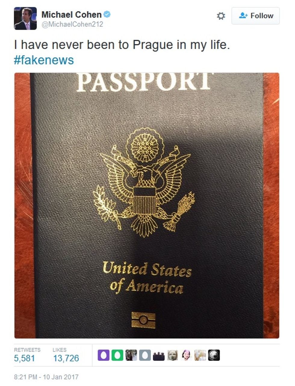 Also, let's not forget that in that mysterious Russian dossier with the pee hookers (who are not the point), Cohen was alleged to have been a go-between for the Trump campaign in its alleged collusion with Russian intelligence. The dossier claims he met with Russian agents in Prague, a claim that has not been verified and which Cohen vigorously denied by posting a photo to Twitter of the cover of his passport, which isn't exactly compelling. Federal investigators are still trying to verify whether anything in the dossier is accurate, but this is definitely a photo of a passport cover:
