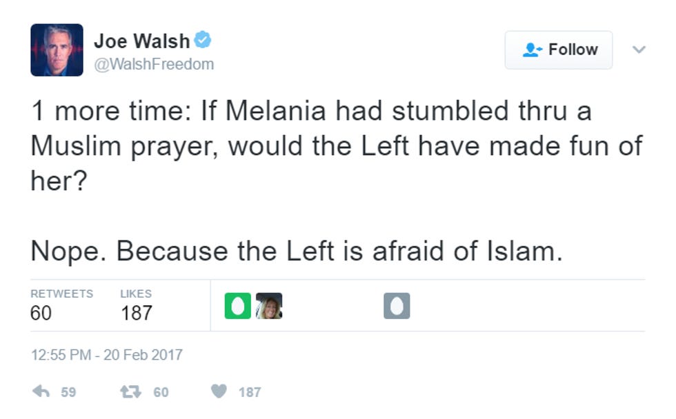 We're convinced! The Fox News link in Walsh's first tweet is here, and surprise, it is a few randos on Twitter saying snarky things. FEEL THE OUTRAGE! Twitchy appears to have assigned at least six and a half of its NINE PAID STAFFERS to find other randos being mean on Twitter. The stupidest man on the internet, Jim Hoft, also reported that liberals were "TRIGGERED AND OUTRAGED" by Melania's praying. Personally, we, yr rabid frothing liberals, didn't even hear about this until these two dorks started whining about it: