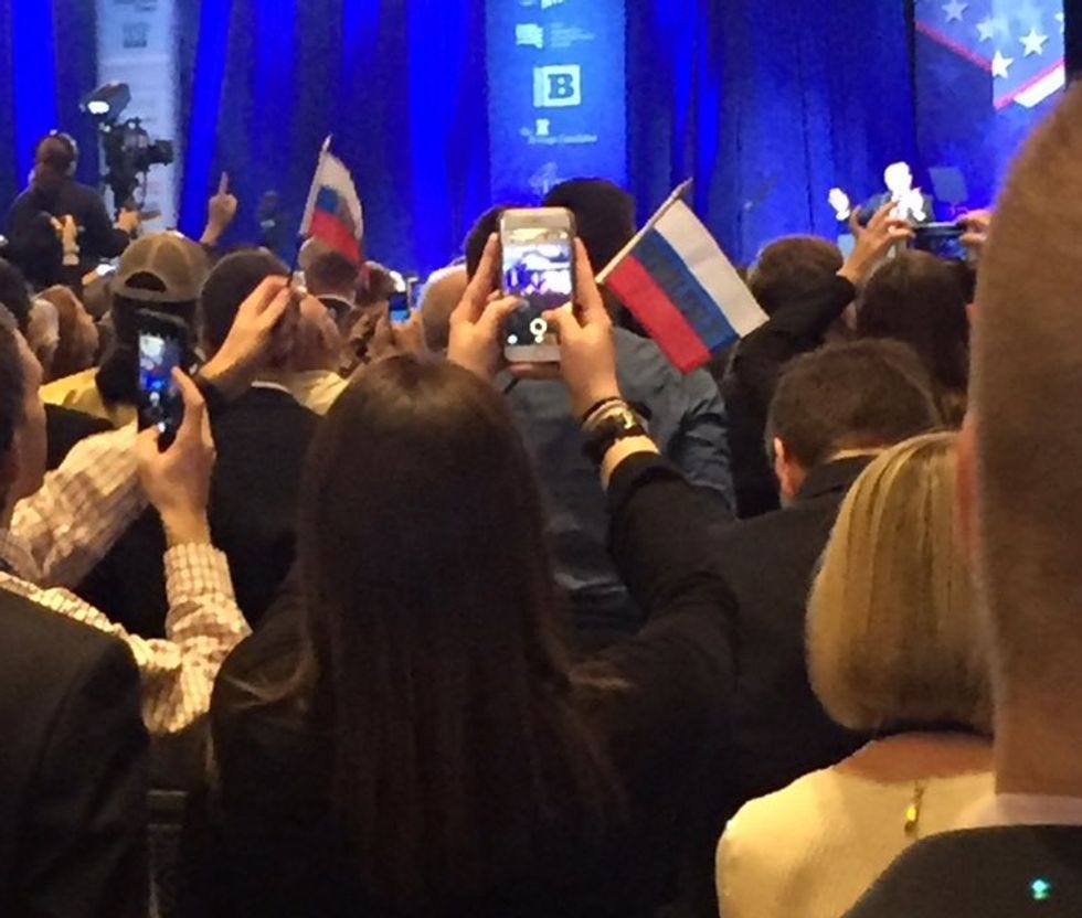 Actually, we already know the answer to the question in our headline: It was epic trolling of the CPAC crowd that had come to hear Donald Trump's incoherent sputterings about fake news and how much he loves the First Amendment ( yeah right ). A gent with a noticeably fake Russian accent handed out a whole bunch of tiny Russian flags with "TRUMP" printed on the middlewhiteblue stripe [why should we even look at the pics? -- Ed.] , and managed to distribute enough of them that they quickly started showing up in Twitter photos of the speech. Peter Hamby, head of news at Snapchat (yes, why shouldn't they have a head of news?) posted the shot up top of CPAC security confiscating the flags, but only after this pic of happy Trump fans waving the things: