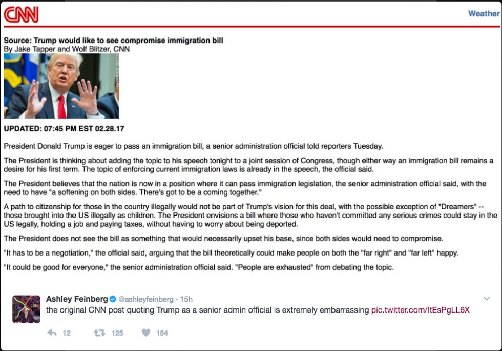 News broke Tuesday night that Trump himself spoke as an anonymous "Senior Administration Official" to several news organizations ahead of his big speech, and was quoted on how "the president" really wants to bring people together with his new immigration policy in which he maybe won't sendall of the Dreamers back to countries they haven't lived in since they were infants.