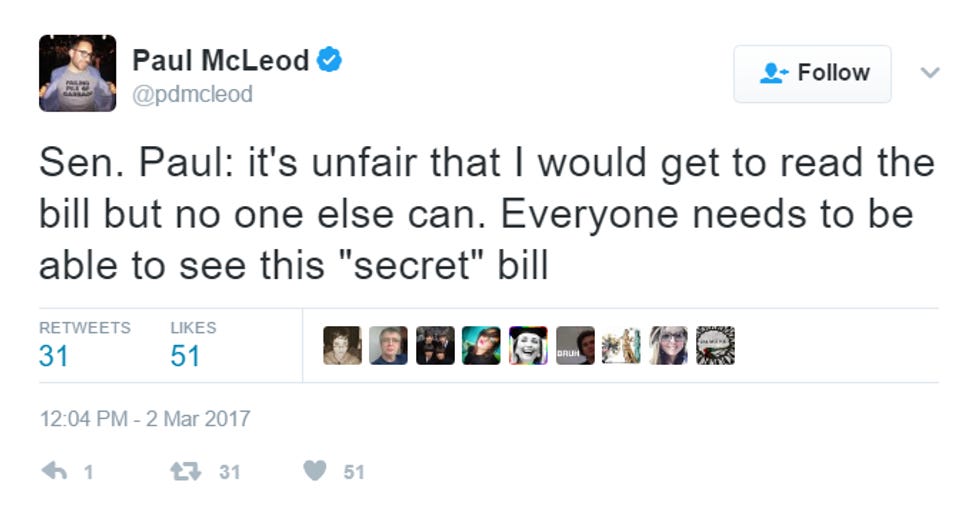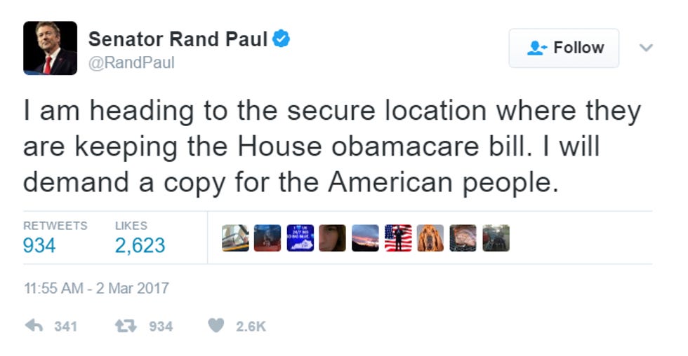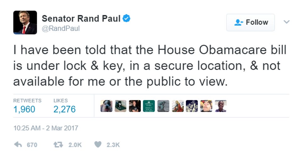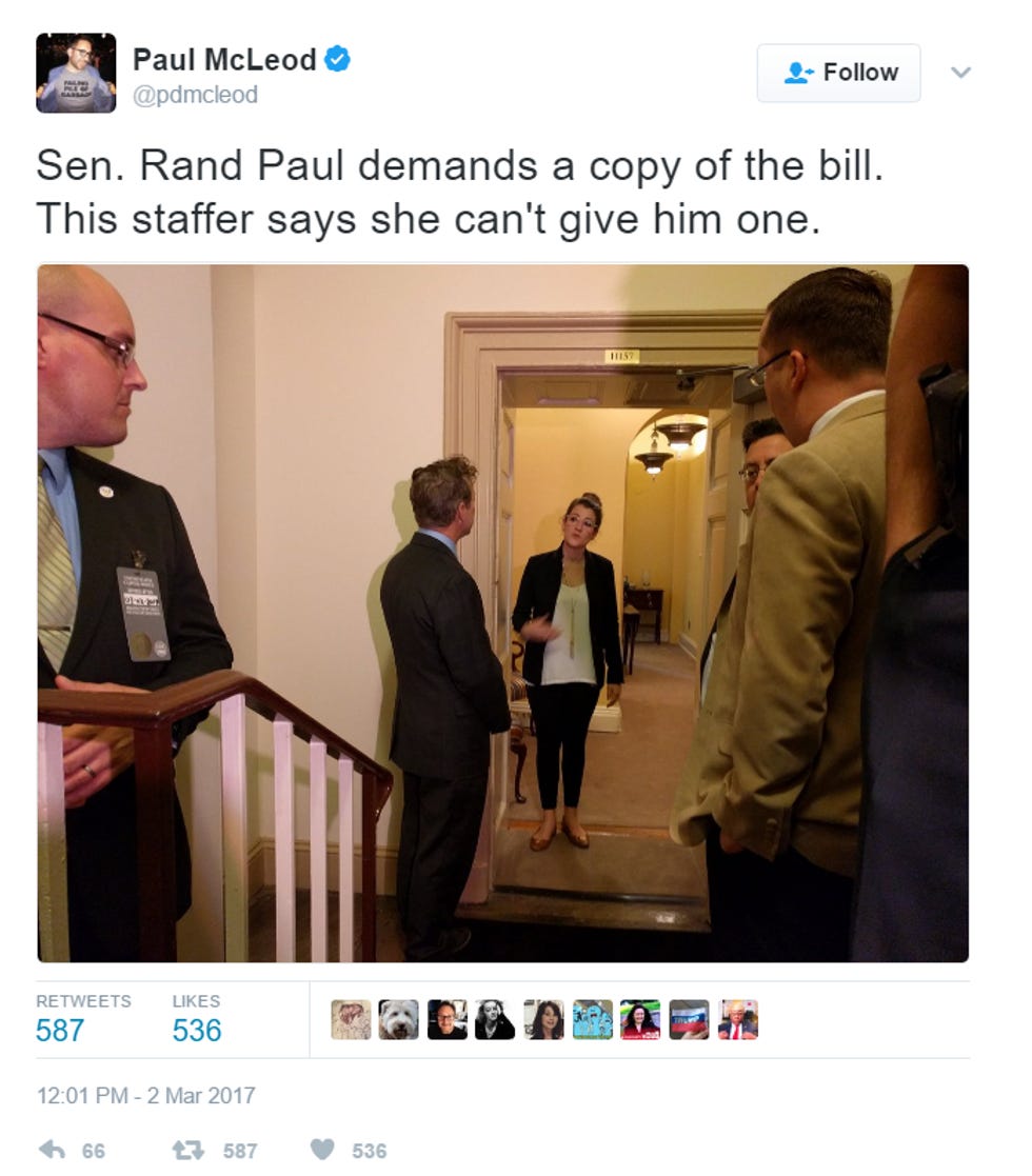 Rand Paul was pissed off! As Paul McLeod reports, Sen. Paul did a little mini-presser about how unfair it was that the House GOP was guarding the bill like a "national security secret," complaining that they wouldn't let him, a nice Republican senator, see it, and saying that goddangit, THE PUBLIC should be able to see it! He even BROUGHT A COPY MACHINE, just in case the bill was too holy and fragile to be moved.