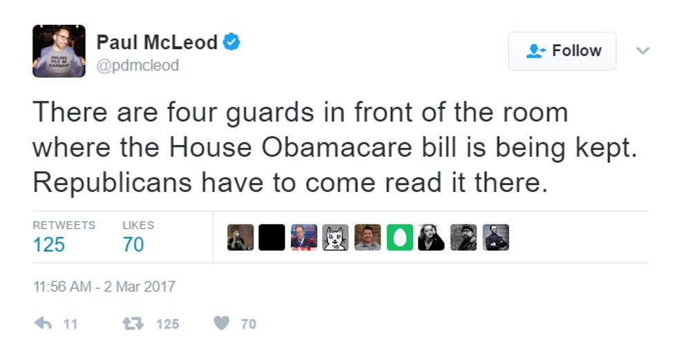You see, Speaker Paul Ryan had earlier explained that the House GOP wouldn't be making its repeal-and-replace bill in a "backroom" in secret like a common Nancy Pelosi, who said so long ago that nobody was allowed to know what was in the original Obamacare bill until they voted on it. ( She didn't really say that. ) But then Ryan changed course and said he was locking his surely amazeballs OCare replacement bill in a super secret basement room called H-157, and that only people who knew the secret password (House Republicans, and also the password is probably "banana hammock") were allowed to enter the room, approach the bill and gaze upon it in its glory.