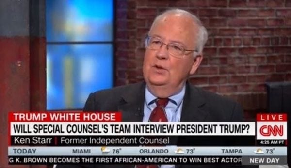 What really surprises Starr is that even though Trump tweets all these crazy things, he really is doing his very best to cooperate with the Mueller investigation, you see. Oh, sure, maybe he refuses to sit for an interview, but that COULD mean Mueller has nothing meaningful to ask him, since the investigation is wrapping up, maybe, without finding anything bad about Trump. See, Ken Starr is NOT A PARTISAN HACK AT ALL.