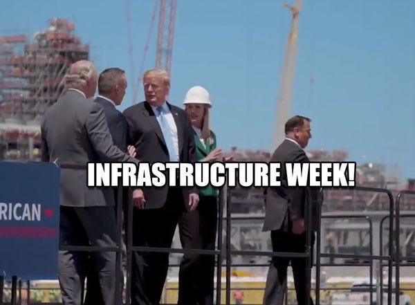 Trump held a rally in Louisiana where, instead of talking about energy policy, he made up names about Democratic candidates, and promised to build a bridge in Louisiana if people vote for him. #InfrastructureWeek.