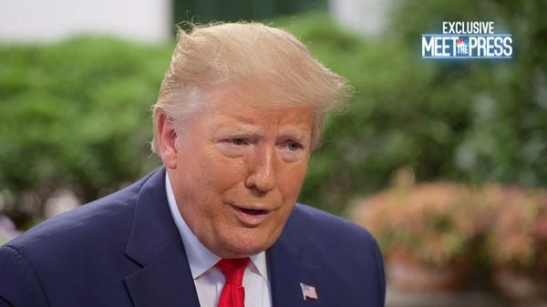 On Friday, Trump sat down with NBC's Chuck Todd to ramble and lie about HIS baby jails, brush off the murder of journalist Jamal Khashoggi, admit that he hadn't actually "read" the Mueller Report (he's "not a WikiLeaks person"), yammer about how he's surrounded by warhawks like John Bolton, that he's not ready to lose in 2020, and that he's thinking about making taxpayers pay him rent to house his presidential library. The entire interview is a waste of time; besides the Eighth Amendment bans cruel and unusual bullshit. [ Full Video ]