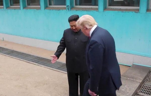 Not content with fondling Russian dictator Vladimir Putin, Trump spent the G20 letting the rest of the world know that he thinks murderous autocrats are the best people. On Saturday, Trump praised Saudi Crown Prince Mohammad Bin Salman and blatantly ignored reporters' questions about the brutal murder of journalist Jamal Khashoggi, saying, "I can't comment on the intelligence community. I guess I'm allowed to declassify ... but the truth is I don't want to talk about intelligence." The very stable genius then shitposted an invitation to North Korean dictator Kim JongUn and the two met at the at the demilitarized zone between North and South Korea where Trump then briefly crossed into North Korea.