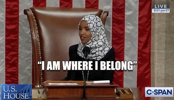 During another Nuremberg-style rally in North Carolina, Trump riled up his sycophants to chant "send her back," a reference to Somali-born Muslim Congresswoman Ilhan Omar. In a series of racist comments,Trump falsely claimed that Omar was sympathetic to terrorist groups, and that the four progressive minority female reps informally known as "The Squad" were part of the "militant hard left" and should "leave" the country. In response, Omar tweeted a poem from Maya Angelou, followed by "I am where I belong," with a photo of herself at the Speaker's podium.