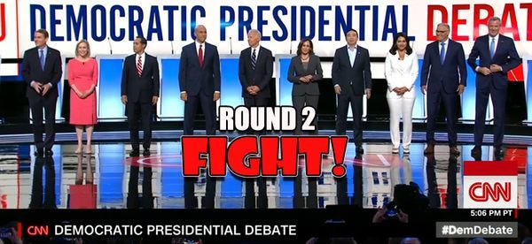 The second Democratic debate was a cartoonish big ball of violence with every candidate attacking one another in the hopes that they could knock their colleagues down a polling point or two. Even members of the audience were attacking as protesters interrupted candidates several times throughout the evening. Former vice president Joe Biden took a beating on everything from criminal justice and immigration to healthcare and women's rights, leaving it to news outlets to 'splain why he didn't support a childcare tax credit for rich people back in the 1980s. Biden called Sen. Kamala Harris's recently released healthcare plan a load of MALARKEY, only to have Kamala uppercut him on his ties to big pharma. When Sen. Corey Booker said Biden was an "architect of mass incarceration," Biden said Booker was a shitty mayor for letting the Newark Police Department use stop-and-frisk. The Washington Post thinks the biggest winners last night were senators Bernie Sanders and Elizabeth Warren, while The New York Times thinks Joe Biden did a great job simply by staying alive through the night. [ Transcript / Fact Check / NPR Analysis ]
