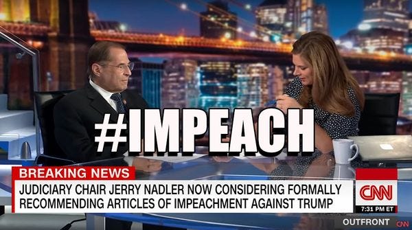 Last night House Judiciary Chair Jerry Nadler said that his committee had begun "formal impeachment proceedings" against Donald Trump. Nadler says his committee will decide by the end of the year whether or not to refer articles of impeachment to the House floor. In interviews with CNN's Erin Burnett and MSNBC's Rachel Maddow, Nadler said he was still in the process of "gathering the evidence," and that House Speaker Nancy Pelosi had been "very cooperative." He added that the committee had drafted articles of impeachment, but stressed they may be different from anything dropped on the floor, IF they drop anything at all. [Erin Burnett / Rachel Maddow ]