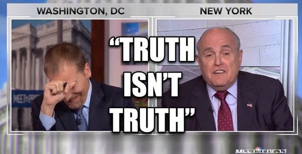 Rudy Giuliani appeared on "Meet the Press" to lie about lying, and lie about Trump's lies on Russian fuckery and ALLEGED obstruction of justice, saying the "truth isn't the truth ." An exasperated Chuck Todd then facepalmed and said, "this is going to become a bad meme," as political nerds slammed their heads against their keyboards and made bad memes. [ Video ]