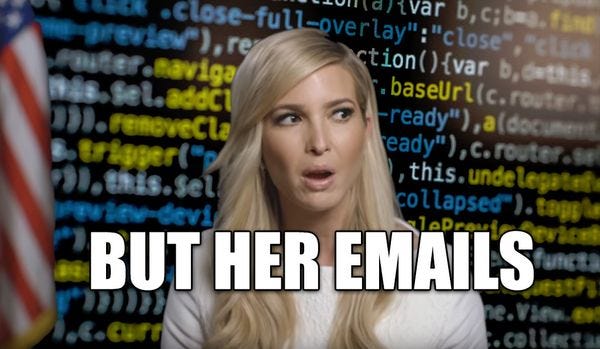 Irony is officially dead now that WaPo is reporting Ivanka Trump sent hundreds of emails from her personal account last year.Crooked Vankysays she didn't know she was criming, and her lawyer says it was totes different from Hillary because Vanky's emails bounced around Microsoft servers, not a secured private server, and were about scheduling and travel (a violation of federal records laws), not classified retroactively. Besides, Crooked Vanky started sending public records through her private account during the transition. LOCK HER UP!