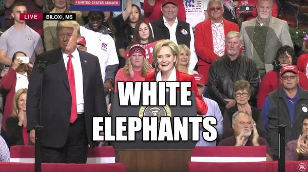 With Cindy Hyde-Smith desperately clinging to his racist coat tailsat two rallies in Mississippi, Trump ranted about the "nasty looking" barbed-wire fence he had built to keep out the invasion of Mexican-Muslim taco trucks driven by anchor babies. He also said immigrants aren't Elvis, that he looked like a blond Elvis , and called Democratic candidate Mike Espy a "socialist." With voters heading to the polls for today's runoff Senate election between Hyde-Smith and Espy, WaPo reports Democrats have been dropping massive resources into GOTV efforts that target black voters, while Politico reports the RNC is not happy it has to dump tons of money into holding a seat for a white power elephant.