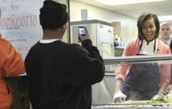 Aww, Michelle Obama went to help out at a soup kitchen for homeless people on Thursday! And while she was there, the AP took a photo of this guy taking a cellphone photo of Michelle's very famous arms. So now America's conservative pundits are very upset that this supposedly homeless man has a telephone, so poverty isn't actually a problem, and we're even "blessed" to have such rich homeless people in the United States.
