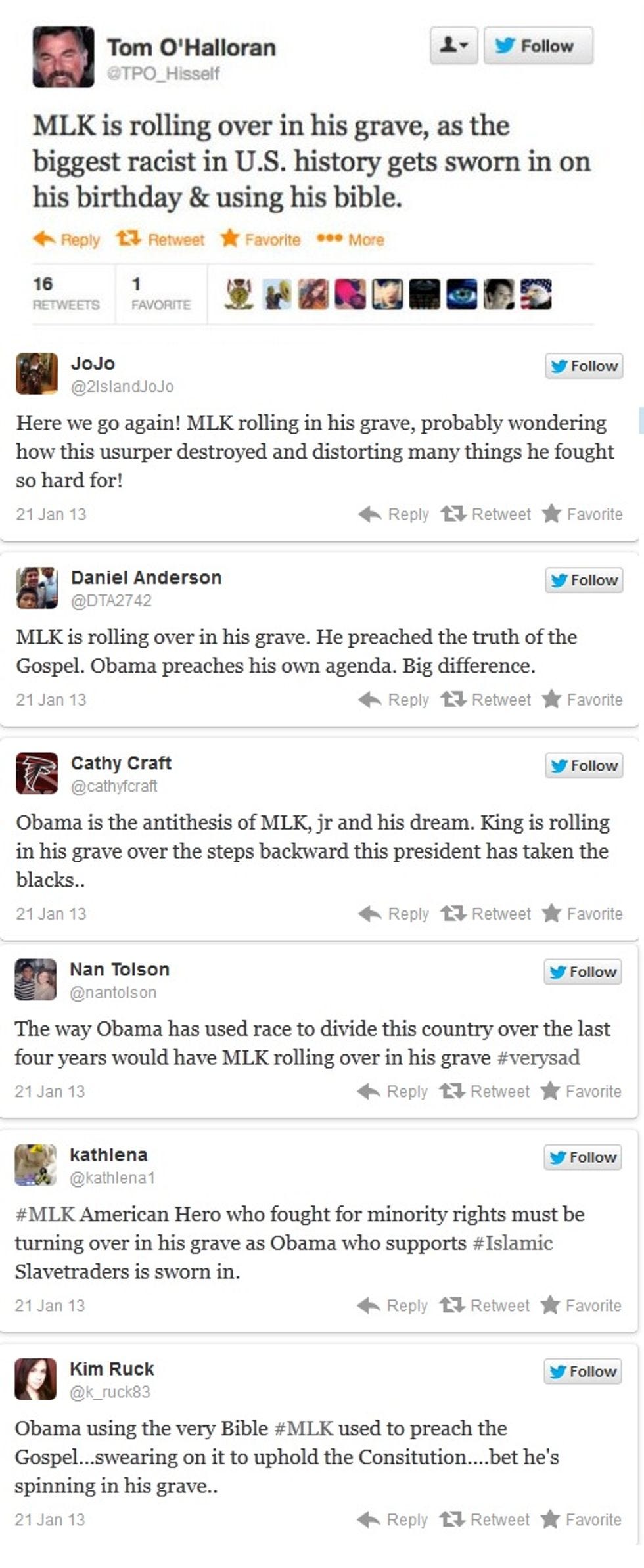 As one or two news sources have noted, today is also the Martin Luther King Day holiday, which a number of astute Tweetospherians noted is the source of great irony, since MLK was a Republican who would have just hated the socialist policies of the tyrannical dictator being sworn in today. They are unanimous in their certainty that the assassinated civil rights leader's corpse expressed its disapproval of B. Hussein Obama with a gymnastics routine. Because really, who understands King's legacy better than a bunch of white people on the Internet?