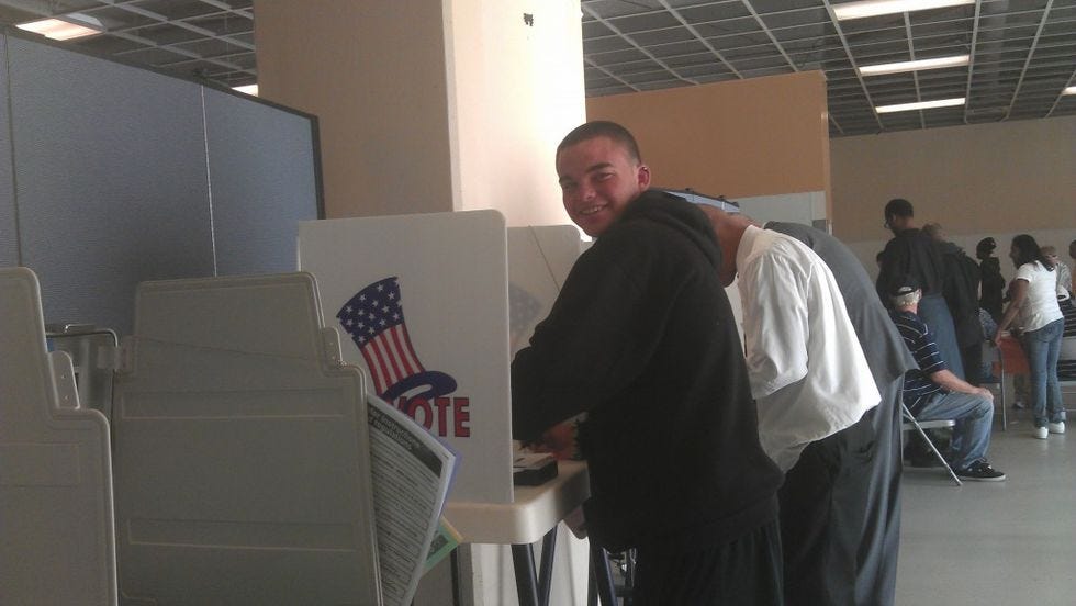 Look at this Cory Booker-looking motherfucker! He was very nice. He pointed out Roseanne Barr's name under the Peace & Freedom party. Is that the same Roseanne Barr? he wanted to know. Yup! Our son, next to him (FIRST TIME VOTER YALL), did not know who Roseanne Barr was. "She used to be famous," we explained.
