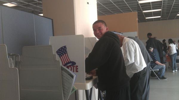 Look at that punim! We were all set to shriek and carry on about our son's constitutional right to the franchise, if they asked for ID, because you are not allowed to ask for ID in California! Then we went to the Secretary of State's website and discovered, in fact, that first-time voters do have to show ID in California! But the awesome lady in charge was not having any of that. "What do you do with a first-time voter?" she asked her befuddled poll worker. As he hesitated, not knowing the answer, she sighed and yelled "MARK HIM OFF, GIVE HIM A BALLOT, HE IS STANDING RIGHT HERE IN FRONT OF YOU!" Problem solved.