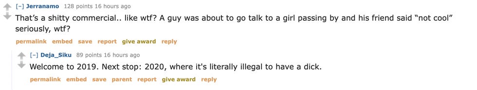 Now, I've looked and looked and looked and I cannot find this advertisement you are talking about. All I can seem to find is this one, from Gillette, which merely suggests that it would probably be good if you didn't go around sexually harassing women, being shitty to them in meetings, letting your kids beat up other kids because "boys will be boys," or otherwise being assholes.