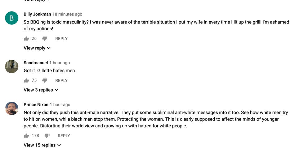 There is no reason to become weak, sobbing, spineless wrecks about this, fellas. It's a commercial and some psychological guidelines for therapists working with men who may have certain issues. If it doesn't apply to you, if you're doing okay, it's not about you! However, if you are Piers Morgan, if you are a participant in one of the many manosphere forums, if you are angrily commenting on YouTube that a razor company is trying to murder you for having big muscles or whatever -- it probably is about you. It probably is affecting your life and the lives of those around you. And you should seek help. For real.