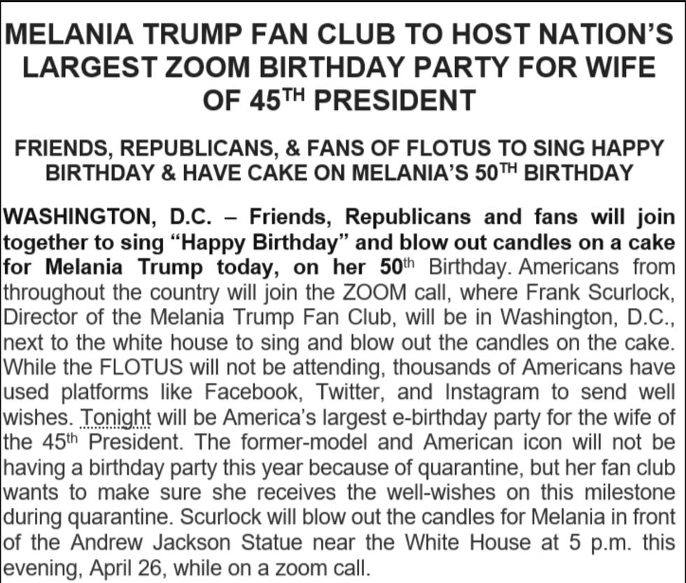 "Scurlock will blow out the candles for Melania in front of the Andrew Jackson Statue near the White House at 5pm this evening, April 26, while on a zoom call," the press release explained.