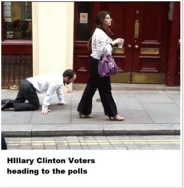 All politics is gonadal. Given this reality, the most effective political persuasion techniques are those that evoke the ancient rhythms of the sexual market. Converting deeply gay, male Hillary partisans to The Trumpening is not likely in the cards but, if sufficiently shamed and ostracized by effective COPROP that leverages the power of anxiety over one’s sexual market status, many nominal males who plan to vote for Inmate Hillary can be dissuaded from exercising their right to notarize the featherweight class of their shrunken scrotes.