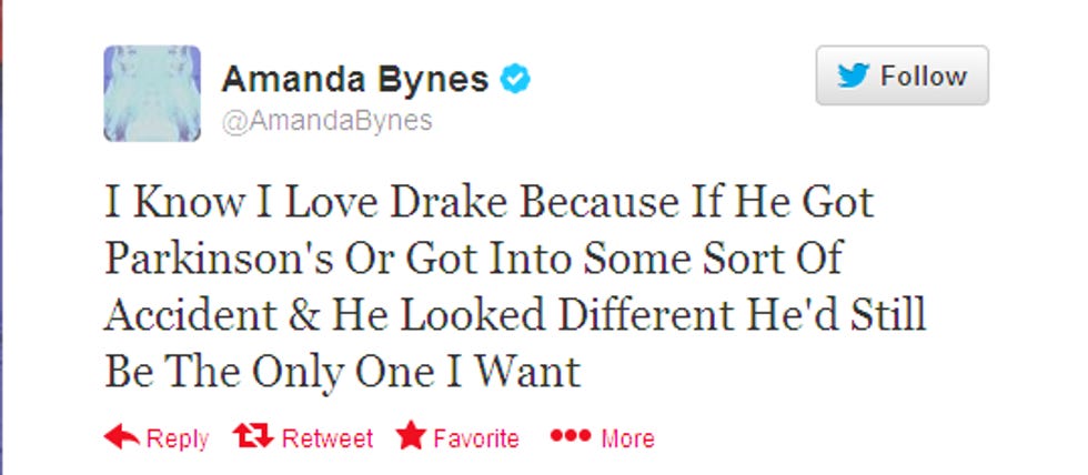 As Amanda Bynes tweets go, this one doesn't really even make the cut. We're dealing with a woman who sorta kinda wished Parkinson's disease on Drake so she could prove she would still love him: