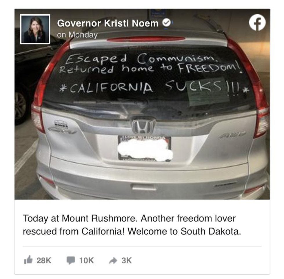 South Dakota GOP Gov. Kristi Noem is somehow a 2024 presidential contender, and she thought it might help her electoral prospects if she insulted at least 11,110,250 Californians. Last week, she posted on her official Facebook account a photo of car she claims was spotted in a parking garage near Mount Rushmore. The owner had presumably defaced their own rear windshield with the following screed: "Escaped Communism, Returned home to FREEDom!" and "CALIFORNIA SUCKS!!!"