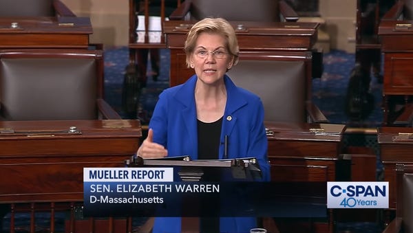 But even better than what Schumer said in response to McConnell is what Senator Elizabeth Warren did , which was to spend 40 minutes on the Senate floor reading the Mueller Report into the record -- especially the good parts! -- and also reading aloud that awesome letter signed by approximately three million former prosecutors, which says that if Trump wasn't currently being protected by DoJ policy, he would have already been indicted for multiple felonies for obstruction of justice.