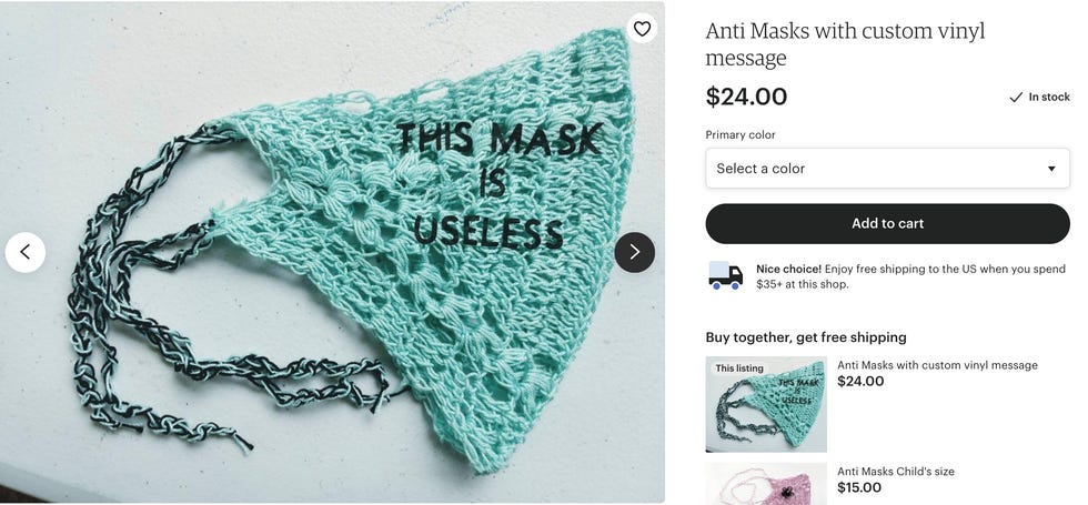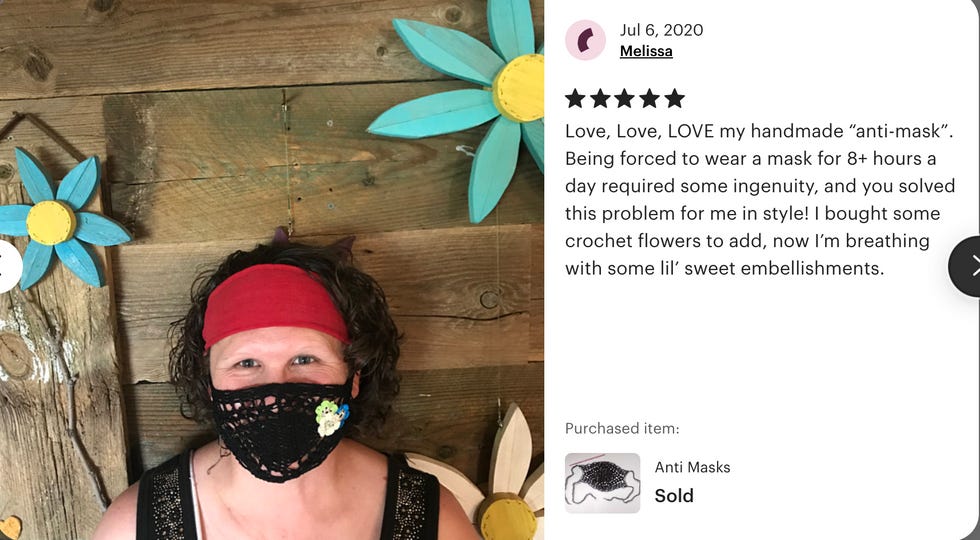 One Etsy listing for a pattern for a crocheted "anti-mask" mask (pictured above) says: