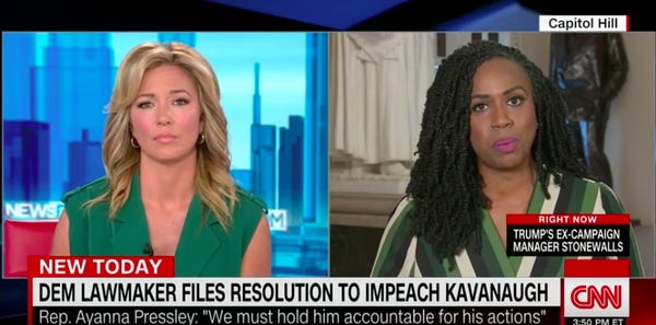 Rep. Ayanna Pressley filed a resolution Tuesday to open an impeachment inquiry into Justice Brett Kavanaugh. A survivor of sexual assault herself, Pressley doesn't believe an alleged attempted rapist belongs on the Supreme Court. There are only nine justices. It's not too much to ask that none of them have any credible rape accusations against them.