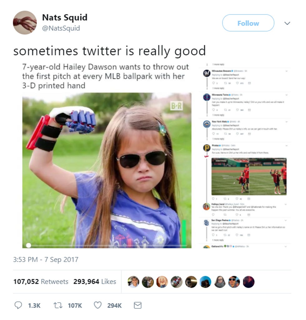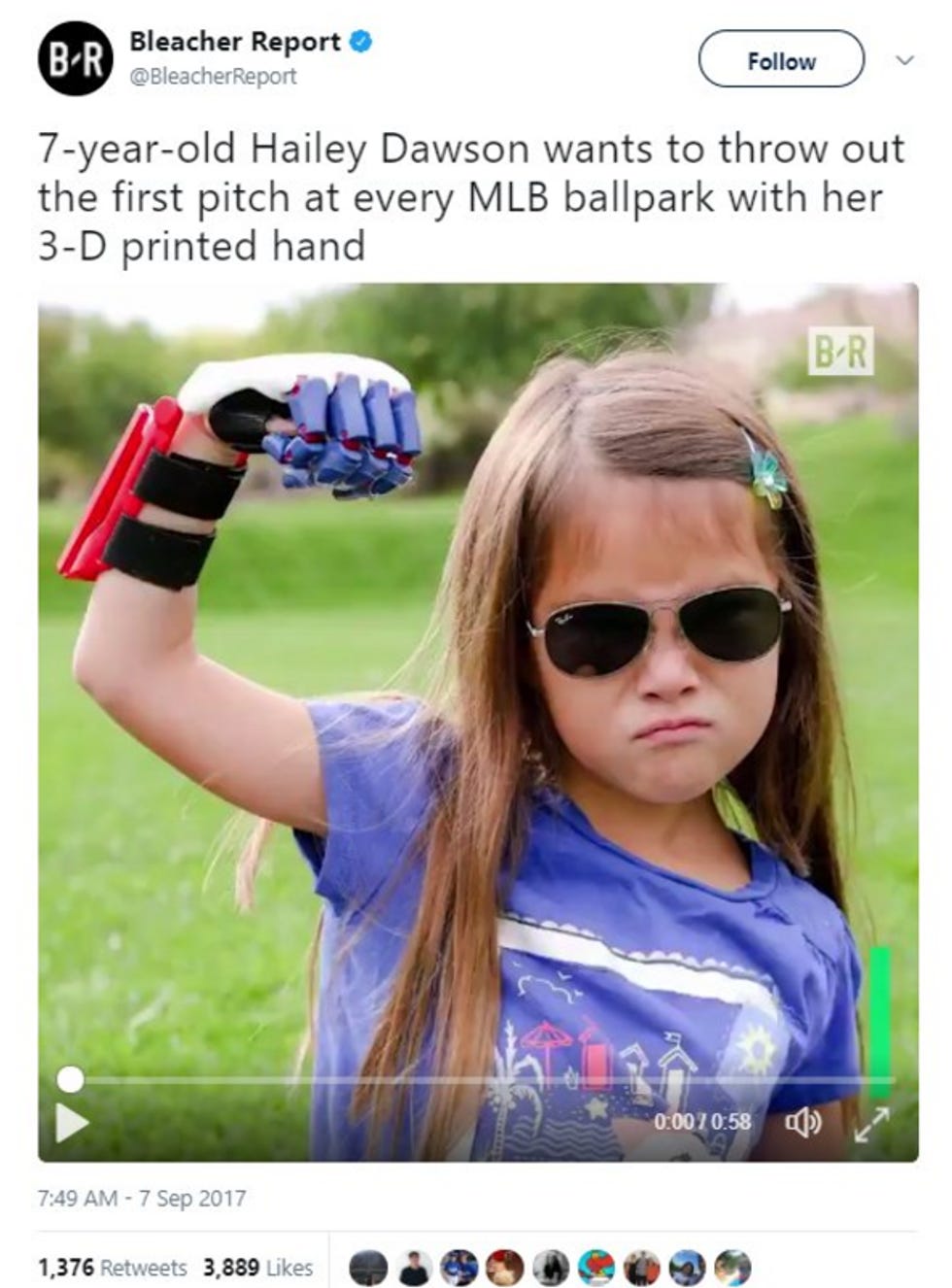 7-year-old Hailey Dawson wants to throw out the first pitch at every MLB ballpark with her 3-D printed hand pic.twitter.com/onStqhEzyB