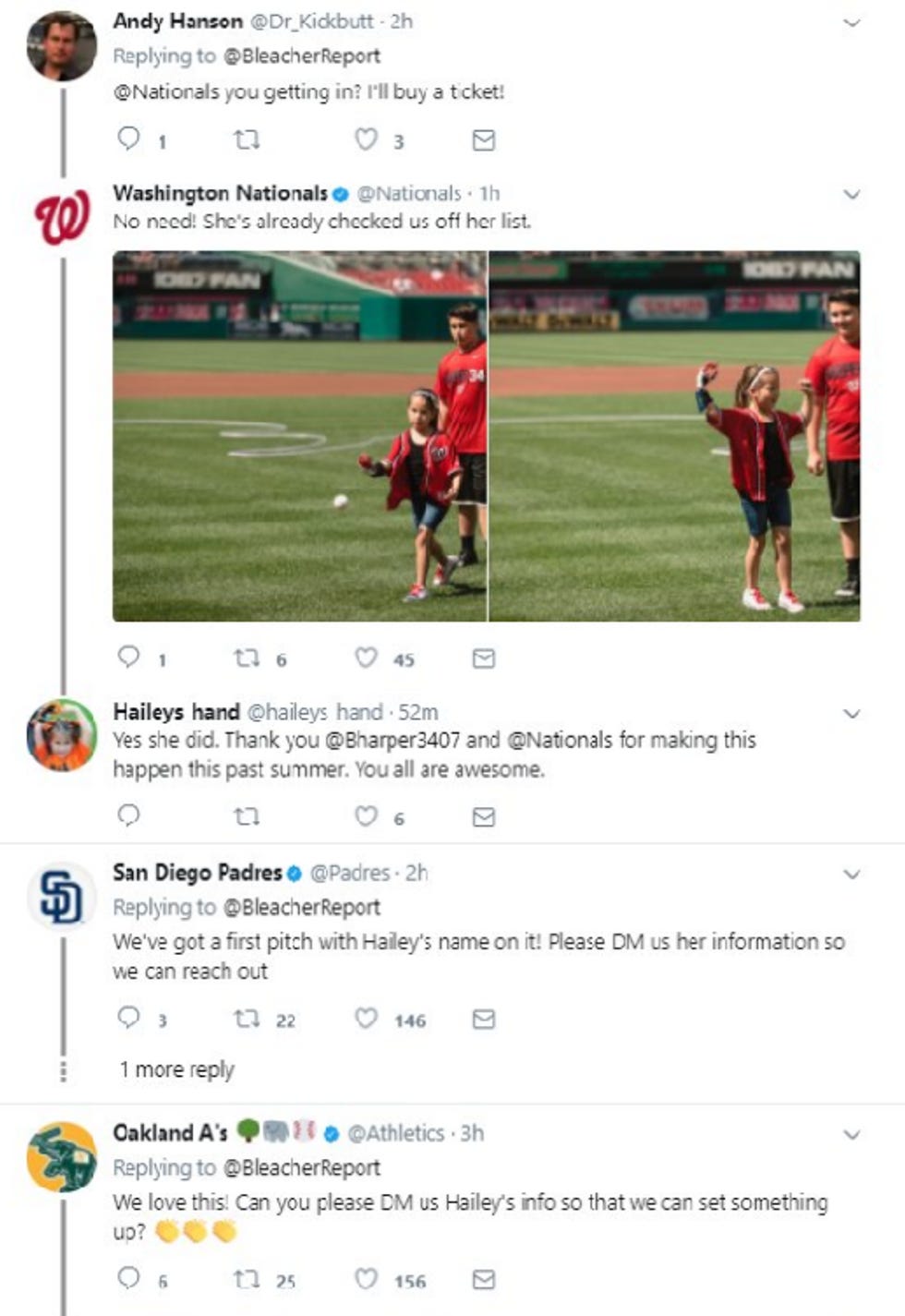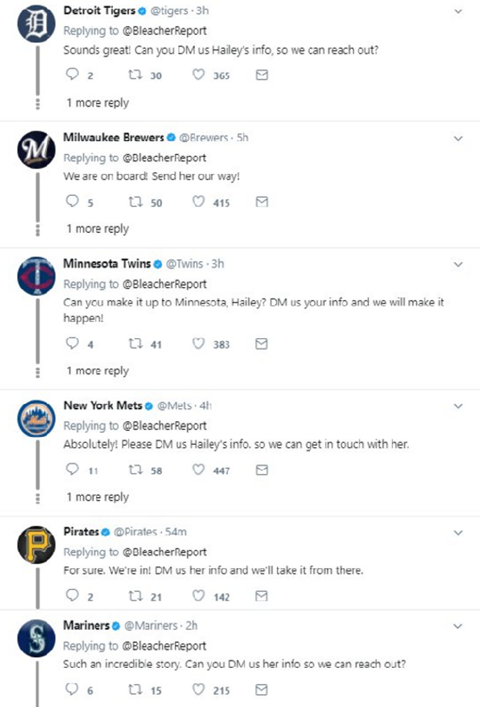 Let's embiggen those pictures, so you can see how the Bleacher Report tweeted that Hailey wants to throw out the first pitch at every single Major League Baseball park in ALL THE LAND, which led every single MLB team in ALL THE LAND to jump in and say, "When the hell can we get this badass kid on our schedule?" SHUT THE FUCK UP WE ARE NOT CRYING YOU ARE CRYING AND ALSO YOU ARE VERY STINKY: