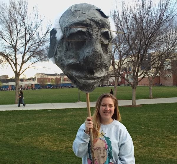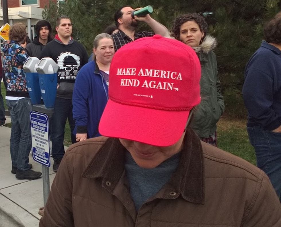 We also talked to a knot of college kids who were attending the rally together; they were all happy to be liberals in a red state, and to see Bernie in person. They've all been following the campaign fairly closely online, but none had heard of "Bernie Bros," which suggests maybe -- you might want to sit down for this -- the stuff the political internet obsesses over doesn't necessarily make it out into the wider world. Of the six, all said they planned to caucus for Bernie Tuesday except for the one seventeen-year-old, who was also the only one in the group who said that when it comes to the general election (which she will be old enough to vote in), she wouldn't vote for Hillary if she got the nomination. She said she'd go with the "red" candidate instead; we're fairly sure she meant "Green," but who are we to nitpick? Maybe Idaho has some hidden Reds out there?