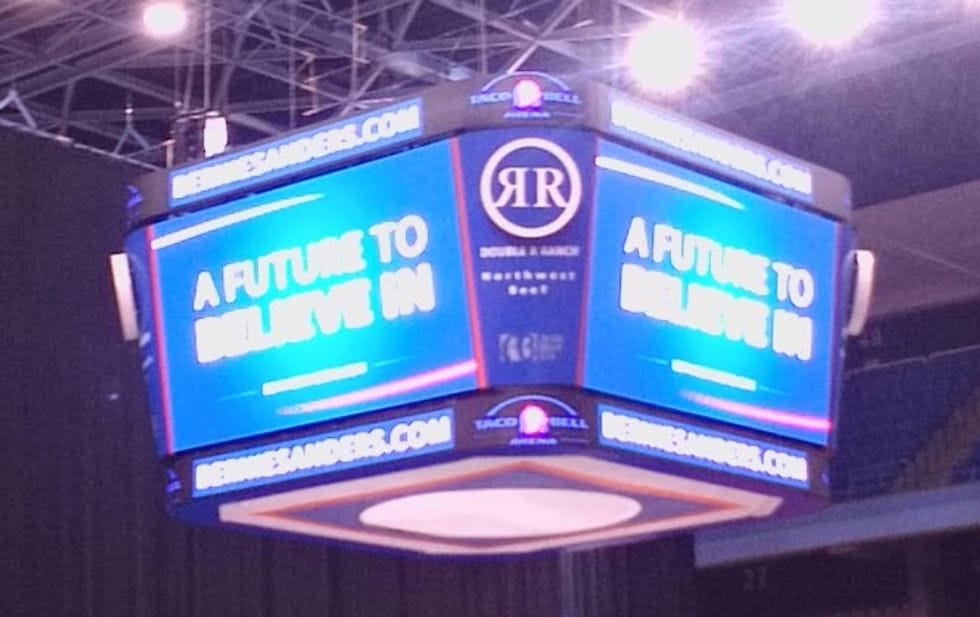 Yr Doktor Zoom was On Assignment Monday at a Bernie Sanders rally in Boise, Idaho, which drew something like 7,000 people to Boise State University's "Taco Bell Arena," which is a thing that exists but does not even have a Taco Bell franchise inside. It was a little jarring to see the Bernie Sanders campaign signs on the giant scoreboard next to the Taco Bell logo: