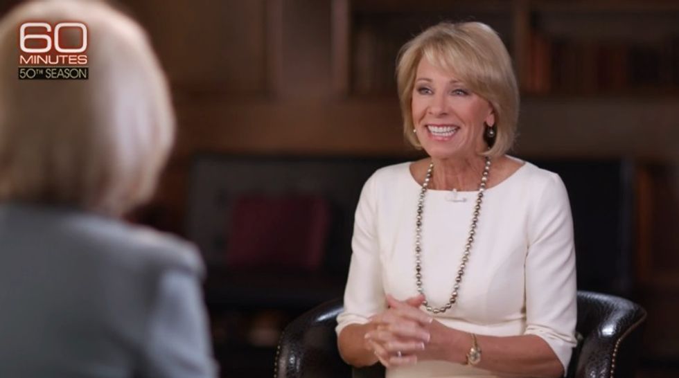 Remember when "60 Minutes" was must-watch TV, when it was known for actually doing tough journamalism, with those interviews where corporate miscreants sweated and lied and gritted their teeth through genuinely compelling interviews? We got a taste of that in Lesley Stahl's interview with Secretary of Education Betsy DeVos Sunday. [Update: looks like the CBS embed didn't work; video available at the 60 Minutes link there -- Dok Z] Unlike too many interviews where public officials just spin out lies to advance their agenda (or get into a shouting match with the interviewer), Stahl very firmly makes clear that DeVos, the billionaire "school choice" advocate who's never worked in a public school (or any school), isn't exactly being honest. Or informed.