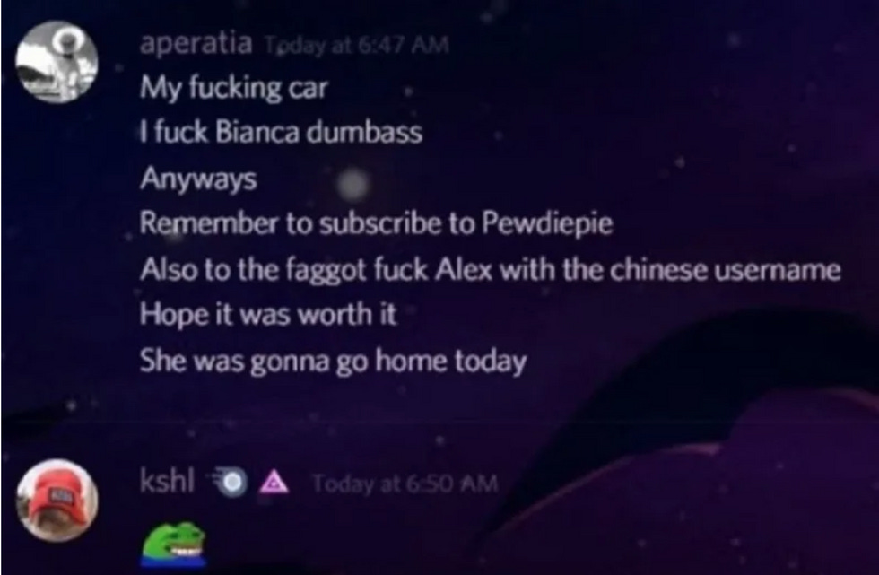 Following the murder, Clark allegedly logged onto Discord and posted a picture of Devlin's dead body, along with the caption "sorry fuckers, you're going to have to find somebody else to orbit," and encouraged people to subscribe to Pewdiepie.