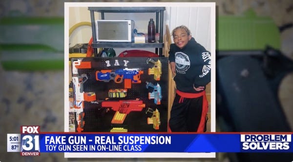 Both Isaiah and the other child received a five-day suspension, as well as a record with the El Paso County Sheriff's Office. There's now a permanent mark on Isaiah's school disciplinary paperwork claiming he brought a "facsimile of a firearm to school." Of course, he wasn't technically in a school building. He was at his home. I don't think it's been made clear that children are required to remove all their potentially offending toys from their own room.