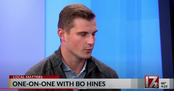 Hines is running for Congress in North Carolina's 13th Congressional District, which is a gerrymandered-ass suburban/exurban thing between Raleigh/Durham and Greensboro/Winston-Salem. He is 27 years old and he says he is a "MAGA warrior." He is a former college football player. He is a trust fund baby moron who just graduated from law school in May.