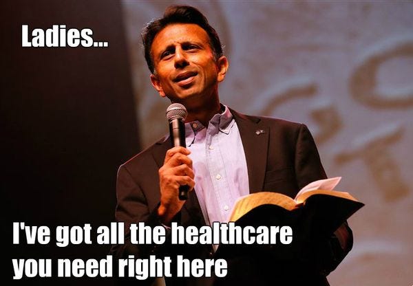 Poor Bobby Jindal. Not going to be president. Not going to make the first debate. Not even likely to stay in the primaries past South Carolina, assuming he gets that far. But maybe, if he can make some grand gestures, he'll capture the imagination of the teabagger wing and be the GOP's wonder boy again, like he was before he made an ass of himself with that State of the Union response where people thought he was aspiring to become an actual pine 2X4. Maybe something dramatic, like taking bold action against Planned Parenthood to punish them for running a used fetus-parts brokerage? That might do it. And so on Monday the governor of Louisiana took decisive action, canceling the state's Medicaid contract with Planned Parenthood, so that the organization that does so much harm to Louisiana's precious little babbies will be stopped from its infernal deeds. A brave stand, and just the thing to recapture Wingnut America's heart.