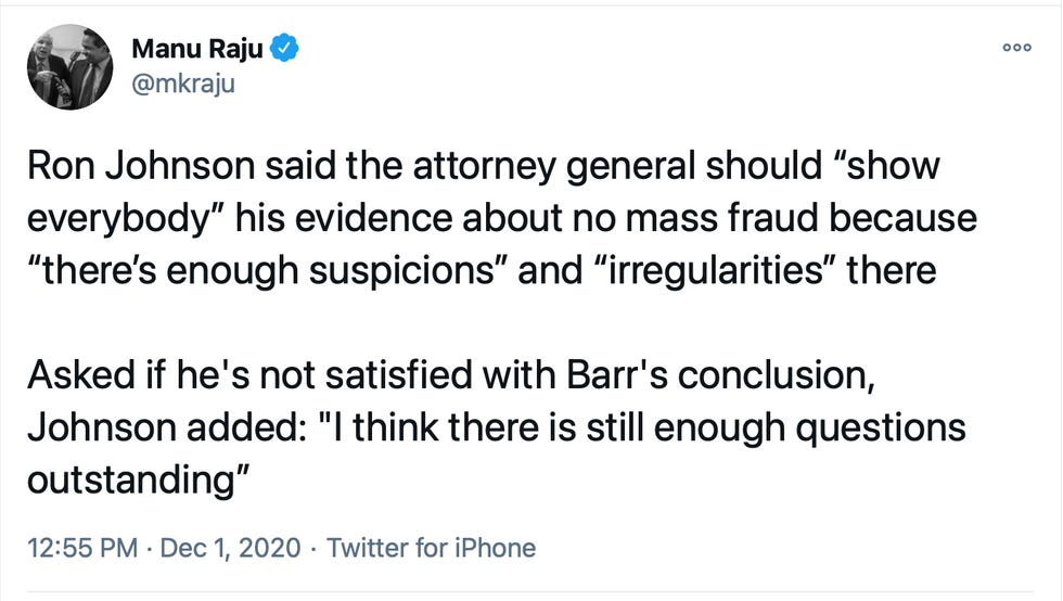Wisconsin's Ron Johnson, the Senate's dumbest Republican and thus the dumbest member of the Senate, demanded that Barr show his work.