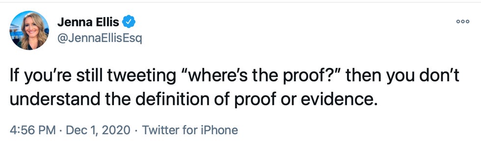 Besides, Jenna Ellis, Trump's dime store lawyer (he was overcharged), insists only common TV lawyers produce “evidence" for their wild, baseless accusations.