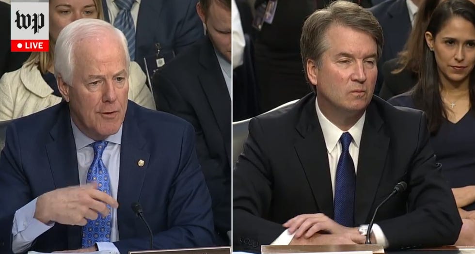 11: 38:Now John Cornyn is saying Brett Kavanaugh is very pretty and wonderful and Kavanaugh is pleased to hear these nice words about him.